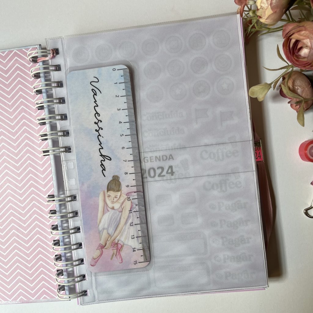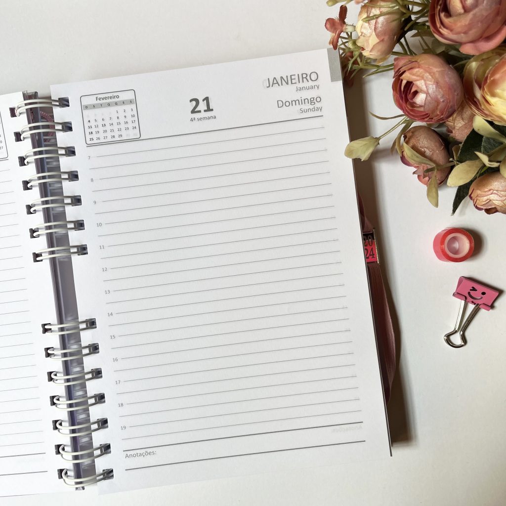 A agenda é tamanho A5 (as folhas medem 14,8 x 21cm) e tem capa dura com nome impresso.