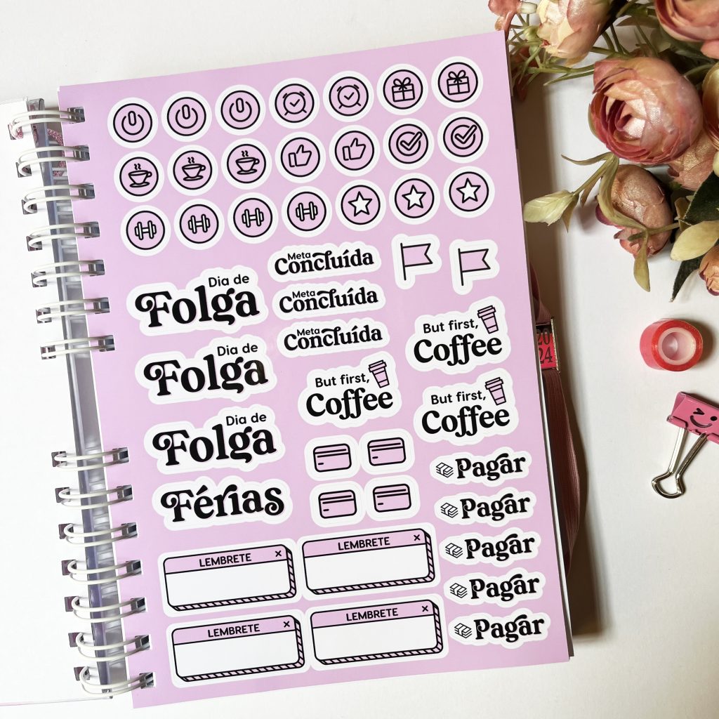 Acompanha cartela de adesivos, envelope plástico para guardar papel e régua marcadora de página.