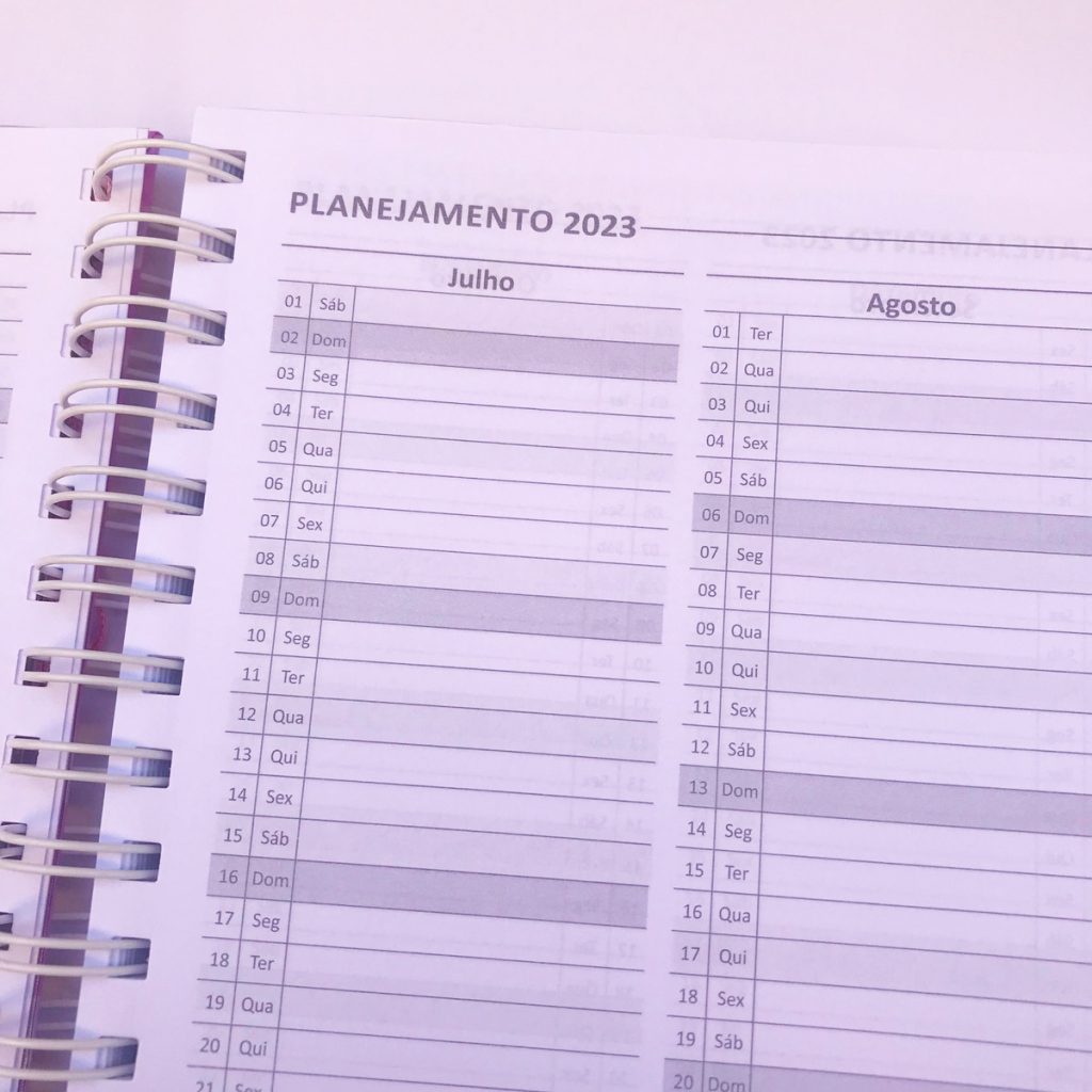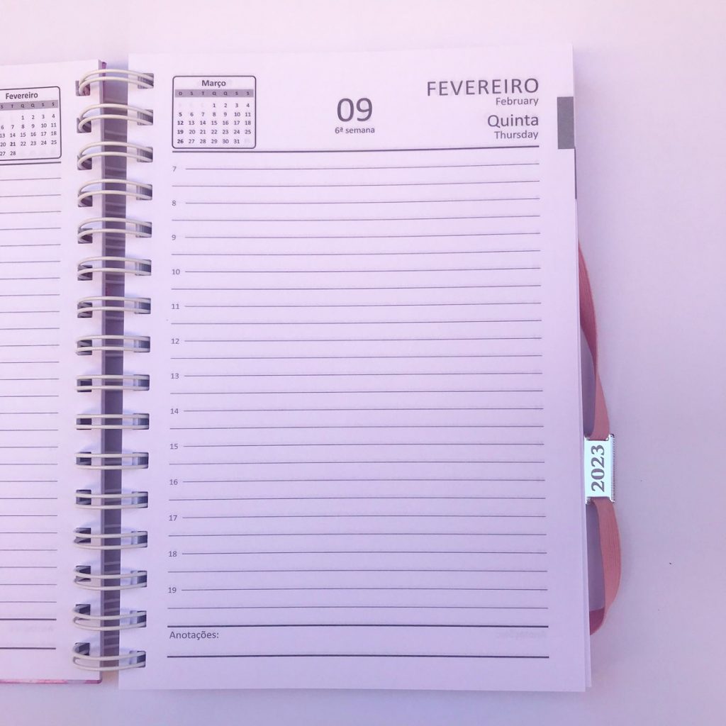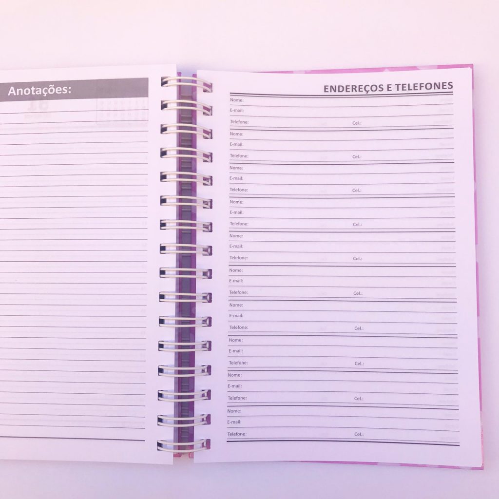 A agenda tem capa dura com nome impresso, envelope plástico, cartela de adesivos e elástico na capa. Agenda com 1 dia por página.