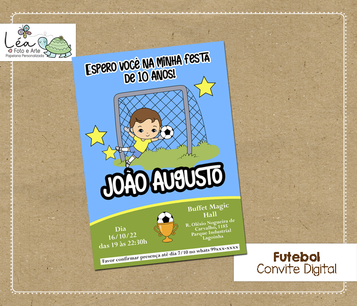 O convite para festa no tema futebol pode ser digital (pra você enviar pelo whats para os seus convidados) ou pode ser impresso. O convite impresso acompanha envelope e adesivo para fechar o envelope.