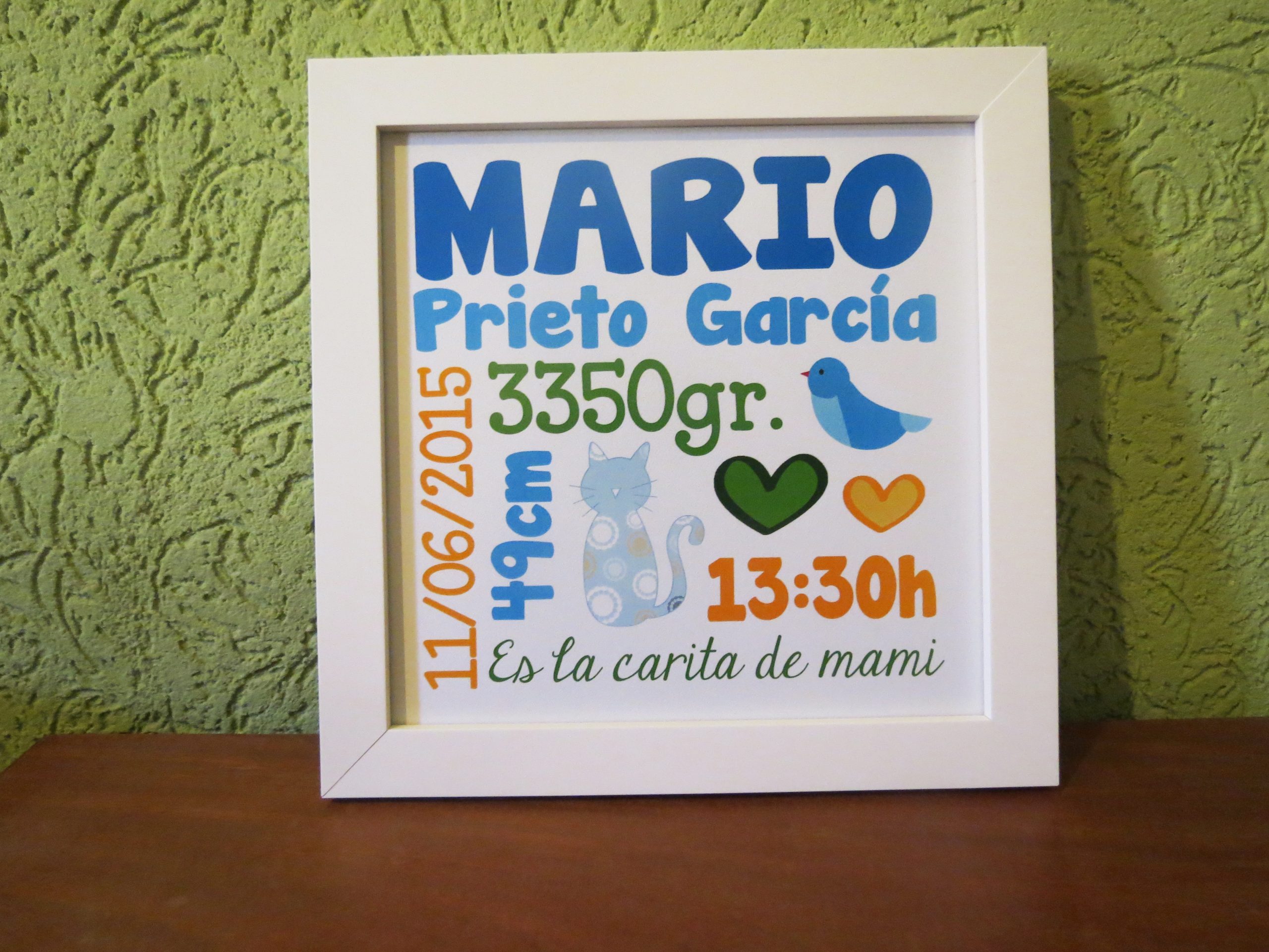 Escolha as cores, os desenhos e mande os dados do nascimento do bebê e nós faremos um lindo quadrinho para o quarto dele (ou dela). O quadro tem cerca de 23,5 x 23,5cm, moldura branca e vidro antirreflexo. Veja mais modelos de quadrinhos aqui.