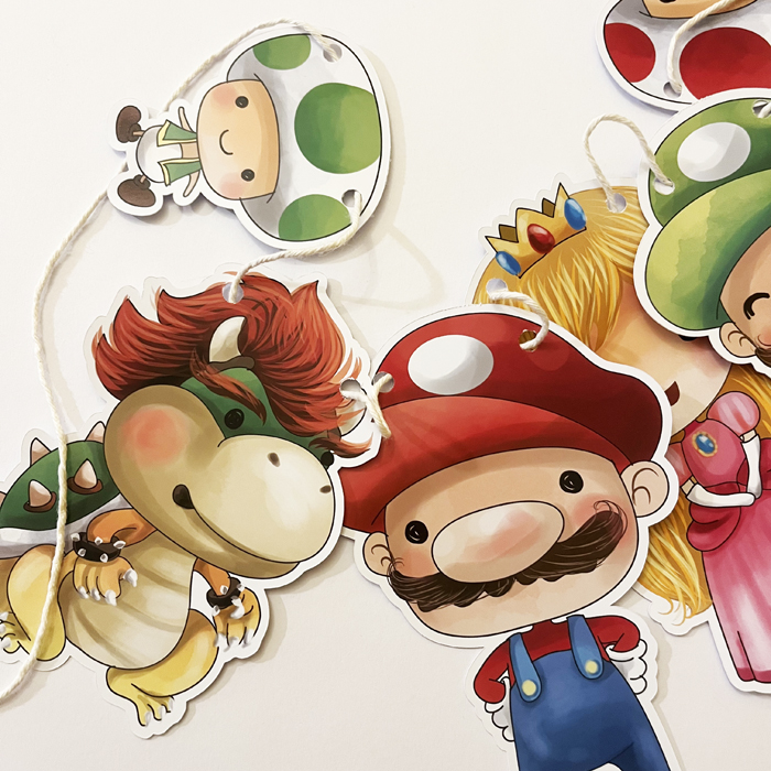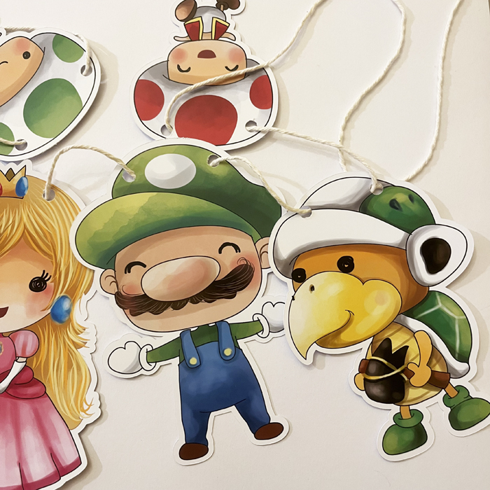 Para festa de aniversário ou mesversário no tema Mario, além do varal para decorar a parede, também fazemos topo de bolo, forminha, tubete, adesivos, toppers, etc.