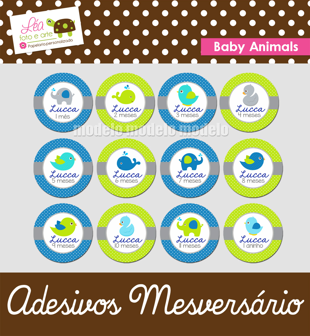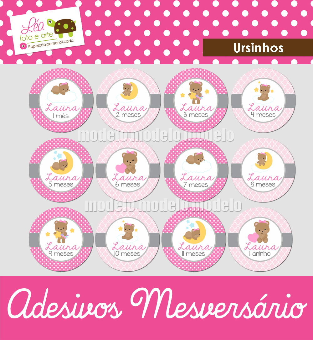 São 12 adesivos redondos de 9cm, de 1 a 12 meses, para colar na roupinha do bebê e fazer as fotos todos os meses. E mais 6 adesivos com o nome. Eles vem em 3 cartelas, com meio corte (é só destacar e colar).
